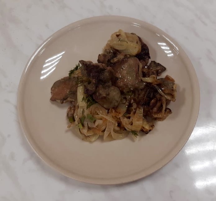 КУРИНЫЕ ПОТРОШКА ЖАРЕНЫЕ С ЛУКОМ (КУХНЯ ГРУЗИИ) (120 ГР.)