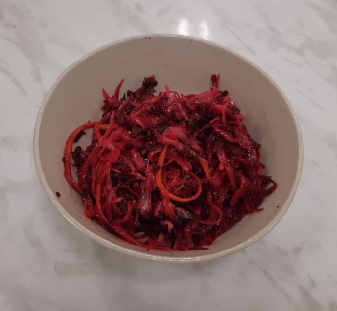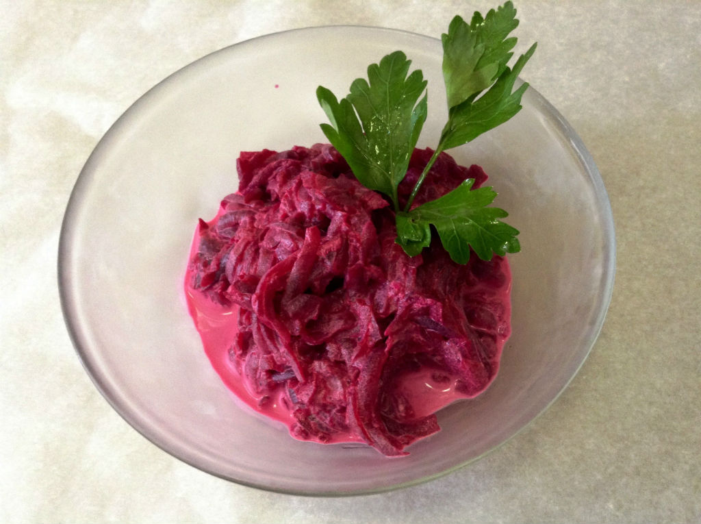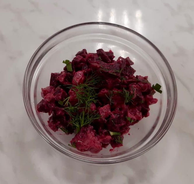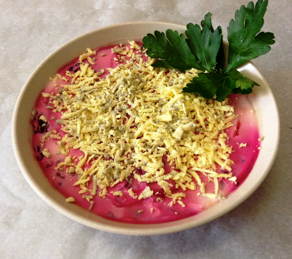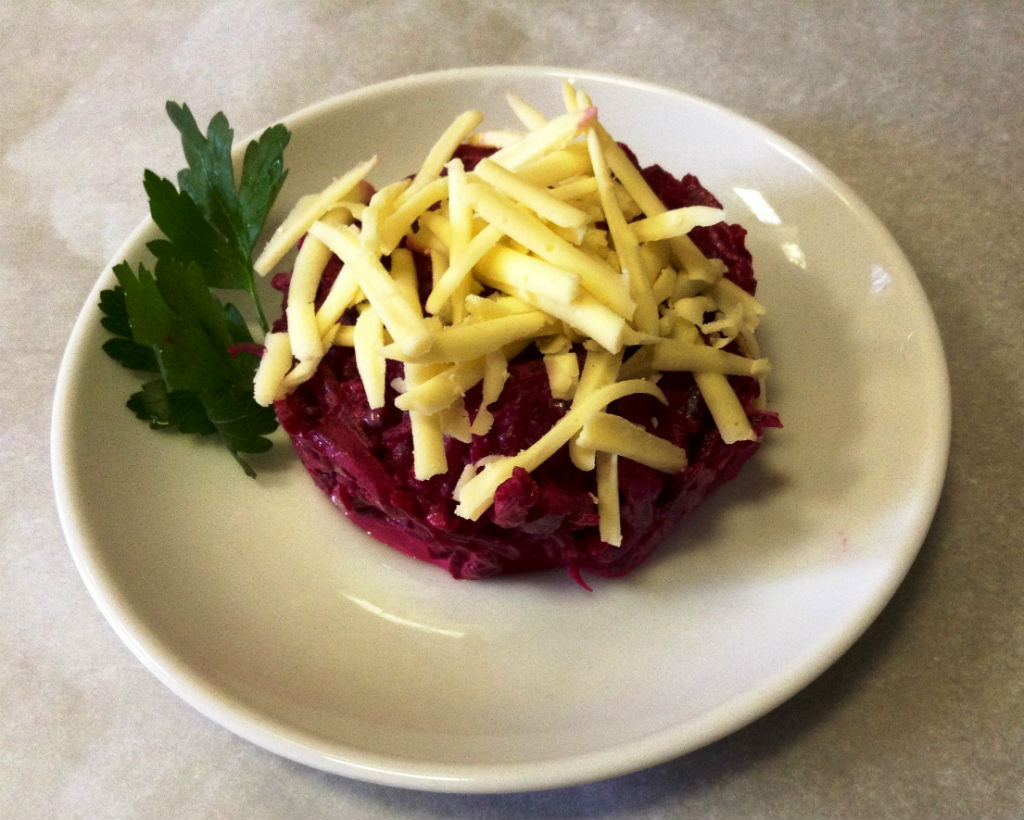 СВЕКОЛЬНЫЙ С ЧЕСНОКОМ, ТЕРТЫМ СЫРОМ И МАЙОНЕЗОМ (150 ГР.)